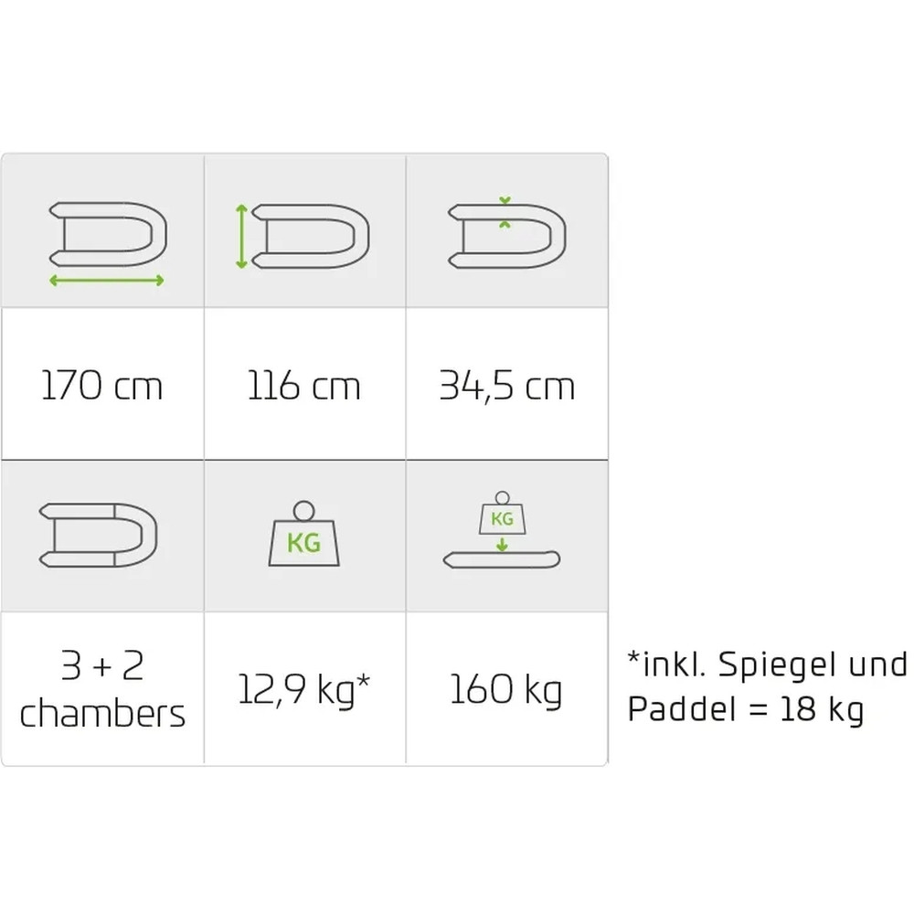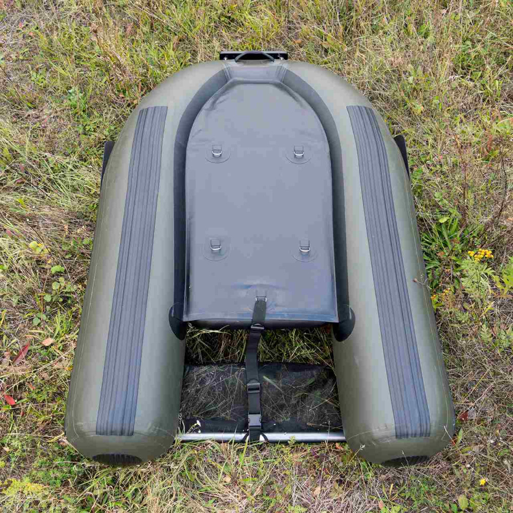 Silný PVC materiál belly boatu bol v miestach, ktoré sú viac namáhané, dodatočne zosilnený silnými ochrannými lištami. Chytré na tomto belly boate sú jednak pádla, ktoré zaručujú rýchlejší pohyb vpred. Na druhej strane je to ale aj zrkadlo na zadnej časti, ktoré je súčasťou dodávky a slúži na montáž elektromotora. Tým sa akčný rádius samozrejme enormne zväčší. Dva adaptéry zaisťujú, že je možné v prednej časti pripevniť držiak prúta a taktiež echolot. Súčasťou belly boatu sú držiak prúta a držiak obrazovky echolotu aj sondy, opravná sada, vzduchová pumpa, prepravná taška, dve bočné vrecká a predná a zadná úložná a krycia sieť.