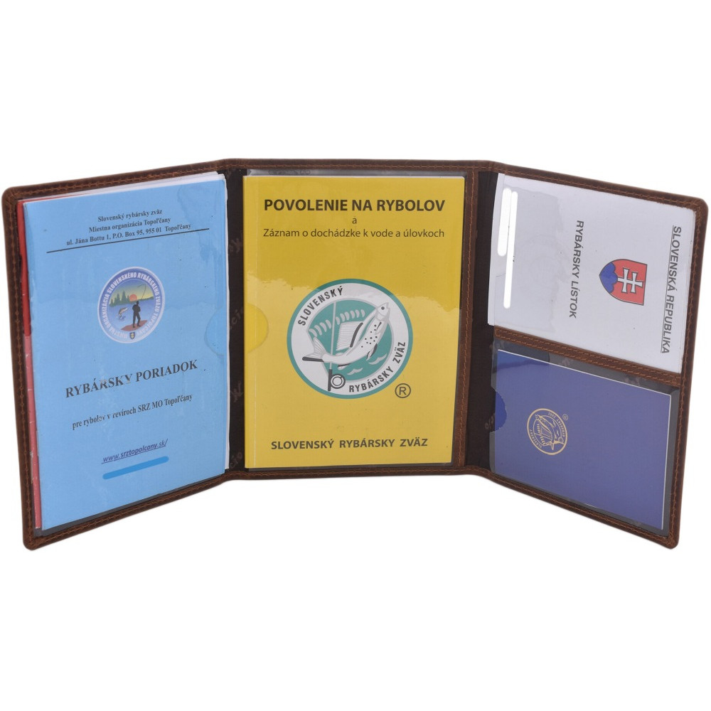 Kvalitné kožené puzdro na rybárske doklady s dvoma malými a dvoma väčšími priehradkami.